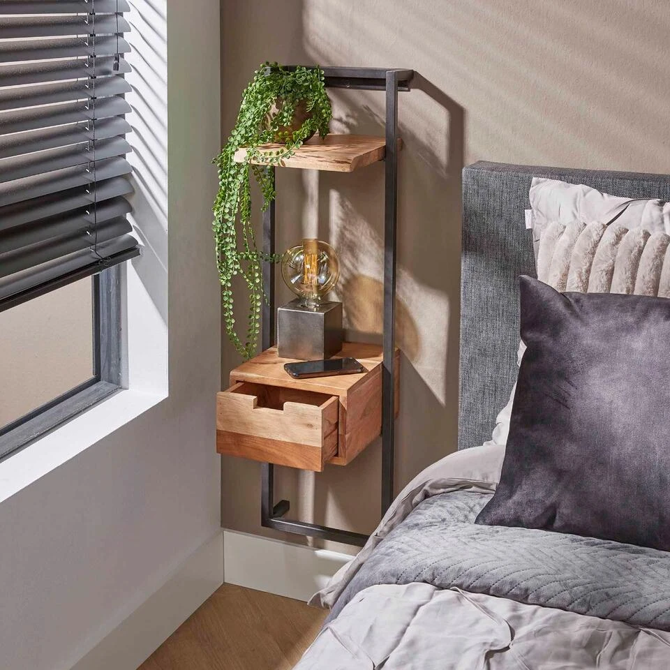 Wij zijn fan van de Alex serie van het geliefde woonmerk Fraaai. En dat is niet voor niks. Deze serie is stoer, natuurlijk, industrieel en kwalitatief hoogwaardig. Alex nachtkastje 30×100 cm is een prachtig zwevend nachtkastje voor iedereen die heerlijk wil wakker worden. Dit nachtkastje is geen standaard type. Ze kent dezelfde stoere combinatie als de overige Alex-items met acaciahout en metaal. Deze combinatie geeft dit nachtkastje een eigentijdse uitstraling en deze is dan ook heel goed te combineren met de meeste bedden.Dit nachtkastje heeft een langwerpig frame en een plankje boven het ‘echte’ kastje. De totale afmetingen van deze kast zijn 100x30x30 cm. Dit nachtkastje wordt door middel van een strip met drie schroefgaten aan de muur gemonteerd, waardoor het nachtkastje hierop kan hangen. Zie hiervoor de foto.