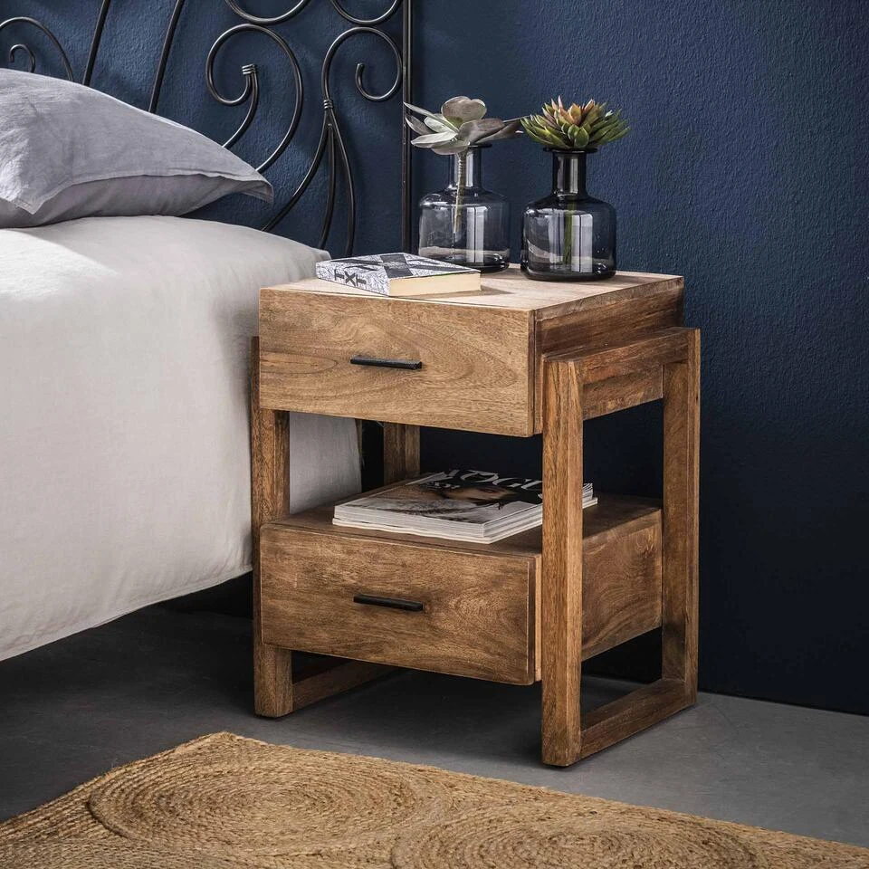 Dit nachtkastje Gobi is gemaakt uit mango hout. Het hout is opgeschuurt wat een vlakke en strakke uitstraling geeft, net zoals de Gobi woestijn. Dit nachtkastje is uitgewerkt met twee lades. Dit nachtkastje maakt deel uit van een serie bestaande uit een nachtkastje met een lade, een tv-meubel en een sidetable.