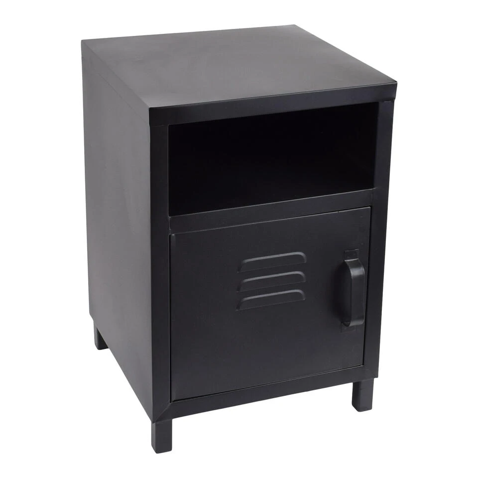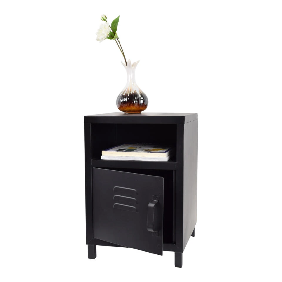 Dit stoere nachtkastje is vervaardigd uit gepoedercoat zwart metaal. Het nachtkastje heeft een deurtje met rooster die de industriele look helemaal compleet maakt.