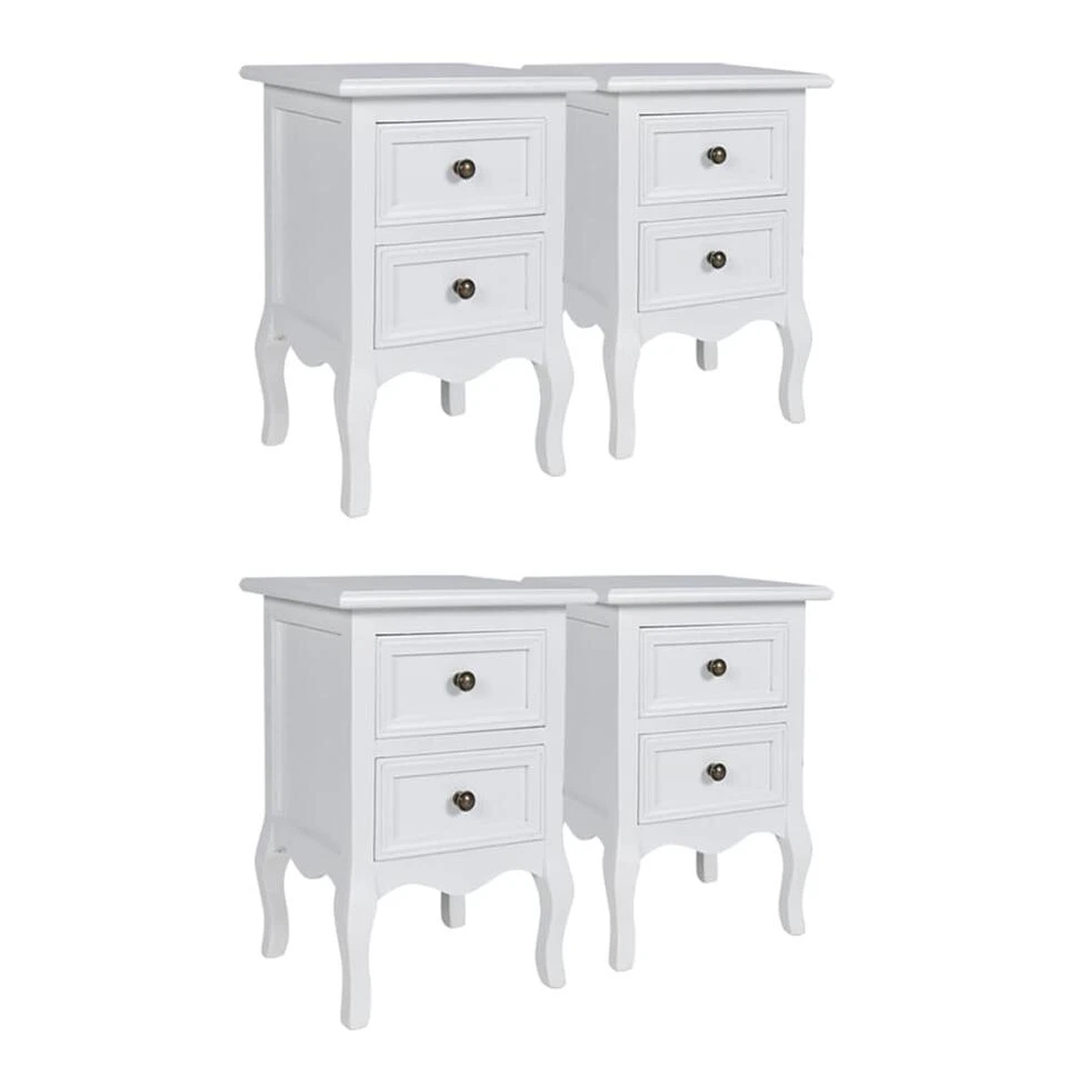 Levering bevat 4 nachtkastjes. Let op: aangezien deze meubels zijn gemaakt van hout en wit zijn geverfd, en ook omdat ze handgemaakt zijn, kunnen ze kleine defecten bevatten.