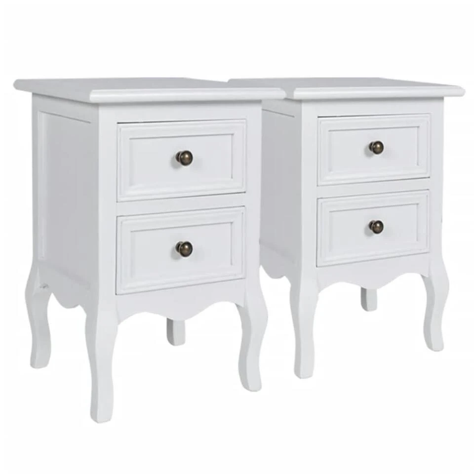 Elk kastje heeft 2 lades. Het transparant gelakte hout maakt de nachtkastjes nog eleganter. Het nachtkastje is afgewerkt met duurzaam wit MDF. Ook hebben ze taps toelopende poten en knoppen van geborsteld nikkel.